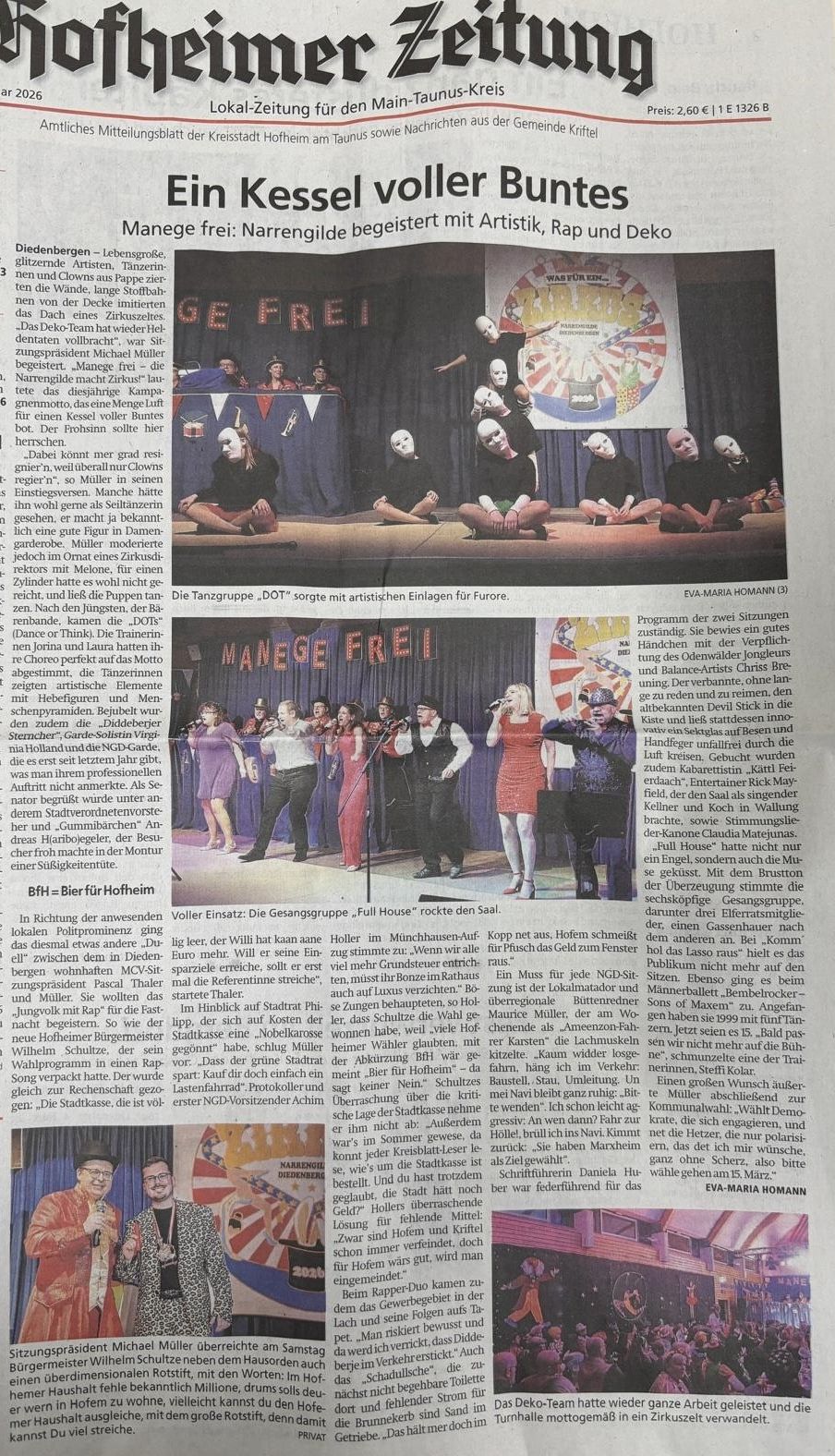 Zur Zeit sind wir einer der jüngsten, wenn nicht sogar der jüngste Fastnachtsverein in der Region. Ihr findet uns im Ortsteil Diedenbergen der Kreisstadt Hofheim am Taunus. Unsere Chronik verrät aber, dass es die Narrengilde schon viel länger gibt. Vor dem Jahr 2011 waren wir eine Gruppe des MGV Frohsinn Diedenbergen 1892 e.V., dem wir auch heute noch freundschaftlich verbunden sind. Seit 2011 sind wir ein eigenständiger, eingetragener Verein, mit stetig steigender Mitgliederzahl, worauf wir sehr stolz sind.